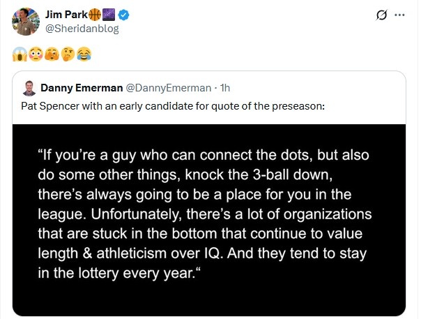 Warriors defender Spencer said in an interview: "If you can connect the team and shoot some other goals, such as three-pointers, then you will always have your position in the league. Unfortunately, many bottom teams still value height, arm length and athleticism, rather than ball quotient. They often only stay in the lottery zone every year."