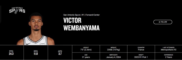 The Spurs officially announced the players' information for the new season. Among them, Banyama's latest height is 7 feet 5 inches (2.26 meters), while last season his height was 7 feet 3 inches (2 meters 21).