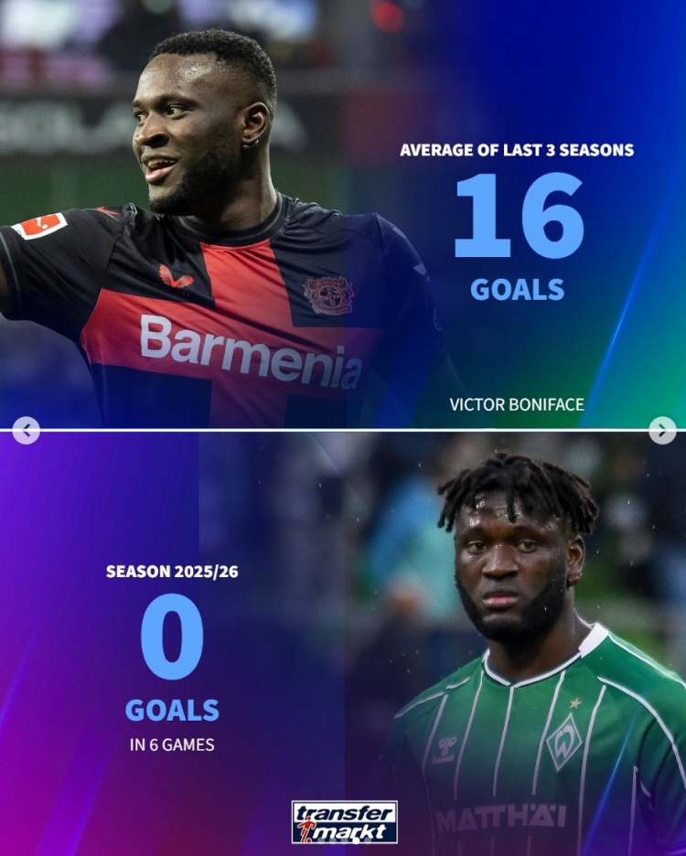 Boniface: 0 goals in 6 games in Bremen this season, an average of 16 goals in the previous 3 seasons