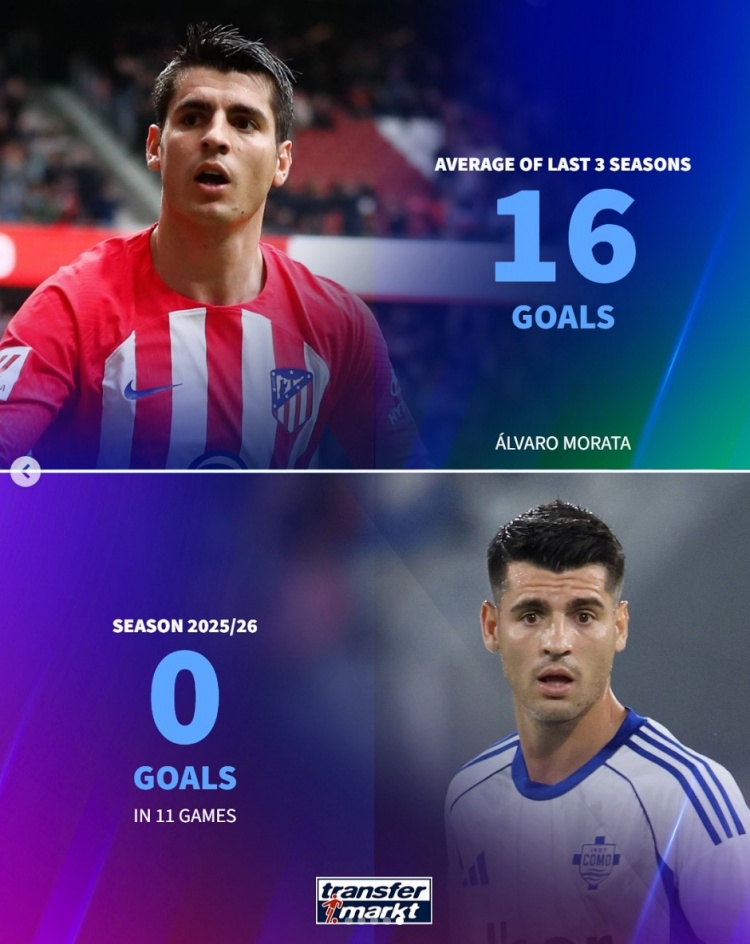Morata: 0 goals in 11 games in Como this season, an average of 16 goals in the previous 3 seasons