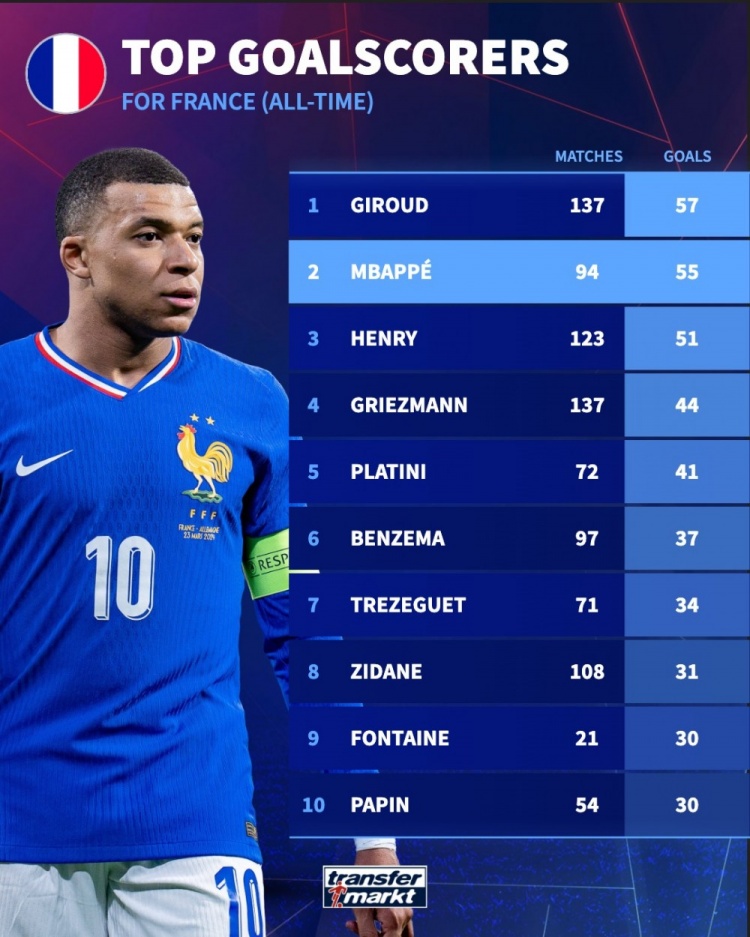2 goals left! France team s all-time scorer list: Giroud leads the list with 57 goals, followed by Mbappe with 55 goals