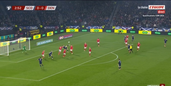 In the final round of Group C of the European Zone of the World Cup Qualifiers, Denmark vs. Scotland. In this game, a draw with Denmark will ensure direct passage, while Scotland, ranked second in the group, must win to overtake and advance!