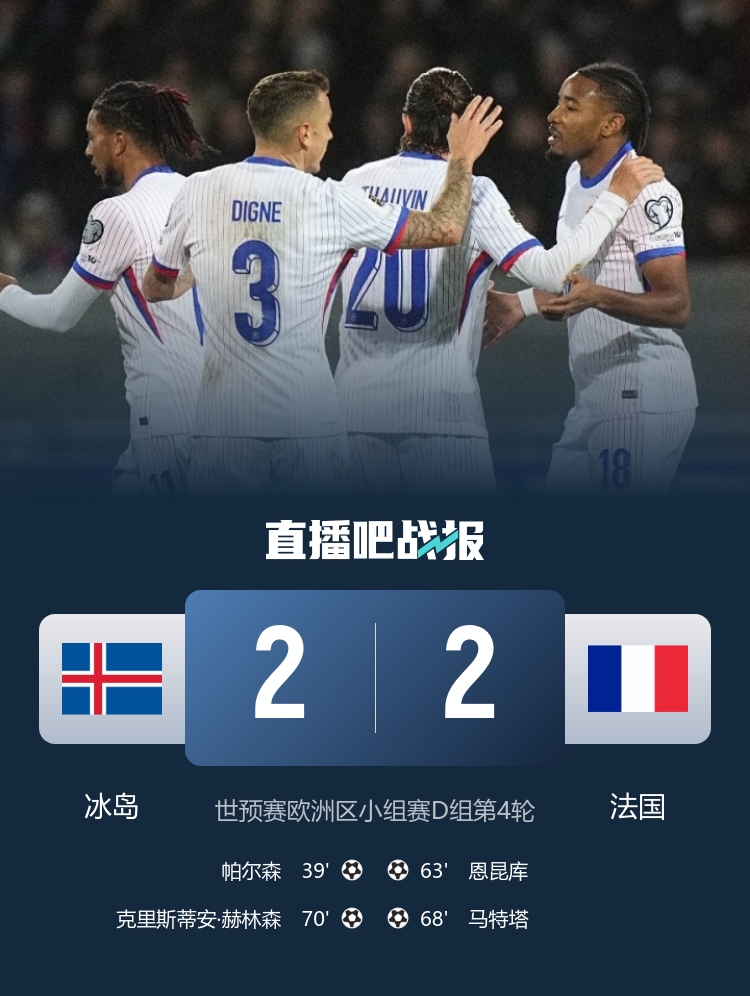 France drew 2-2 with Iceland in this round of world preliminaries. Nkunku and Mateta scored in this game.