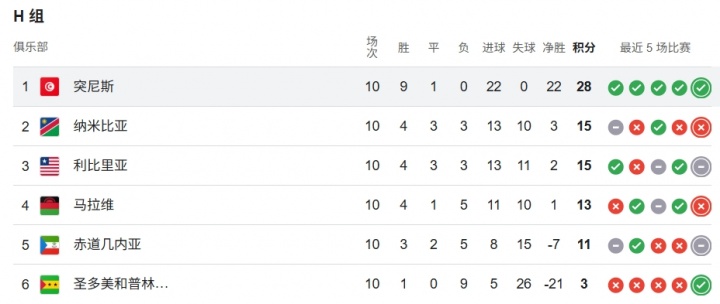 Group H of the African regional group stage of the World Cup preliminaries ended today. In the end, Tunisia ended first in the group with 28 points in 10 games, scoring 22 goals and conceding 0 goals.