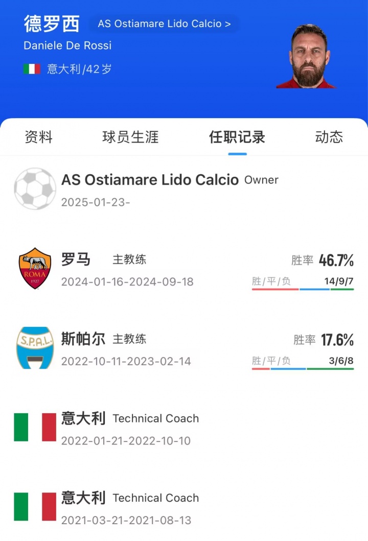 The 42-year-old De Rossi once served as the coach of SPAL and Roma. During his coaching period at Roma, he recorded 14 wins, 9 draws and 7 losses.