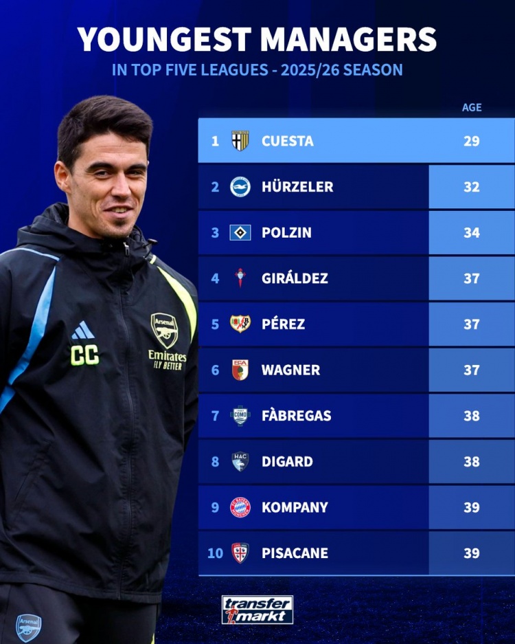 Parma officially announced that the team appointed Carlos Questa as the team's new coach. According to German transfer statistics, the 29-year-old Questa has also become the youngest head coach of the five major league teams in the new season (25-26 season).