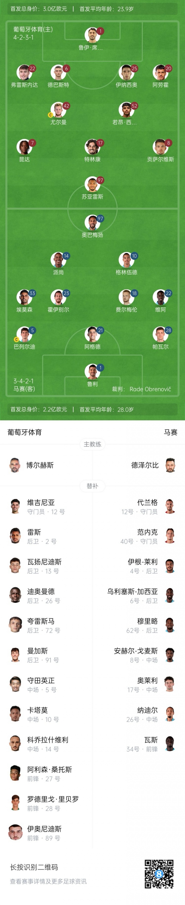 Marseille substitute: 12-Delange , 40-Vanek, 4-Egan Riley, 6-Ulises Garcia, 62-Murillo, 17-O'Reilly, 8-Angel Gomez, 26-Nadir, 34-Vaz