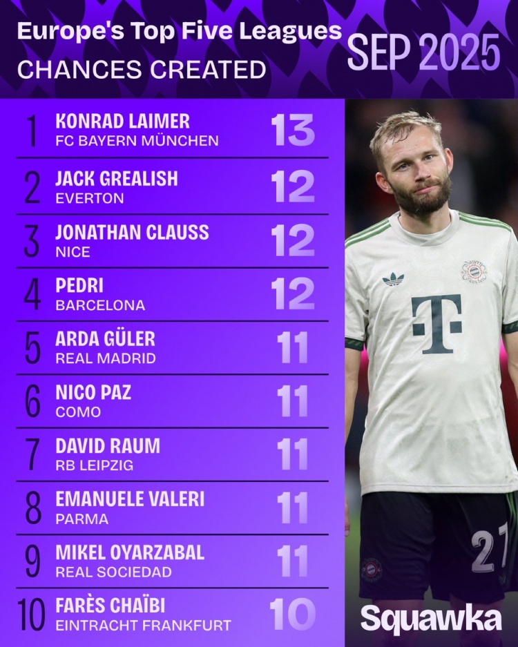 Squawka counted the number of opportunities created by players from the top five European leagues in September, with Bayern defender Lemmer ranked first.