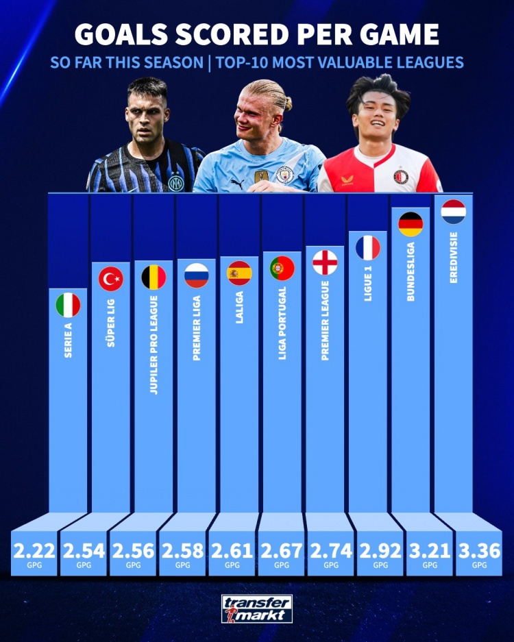 The German transfer market has compiled statistics on the average number of goals scored per game in the top 10 European leagues by total value, and listed the list. The Eredivisie ranks first with 3.36 goals, followed by the Bundesliga, Ligue 1, and Serie A with 2.22 goals at the bottom.